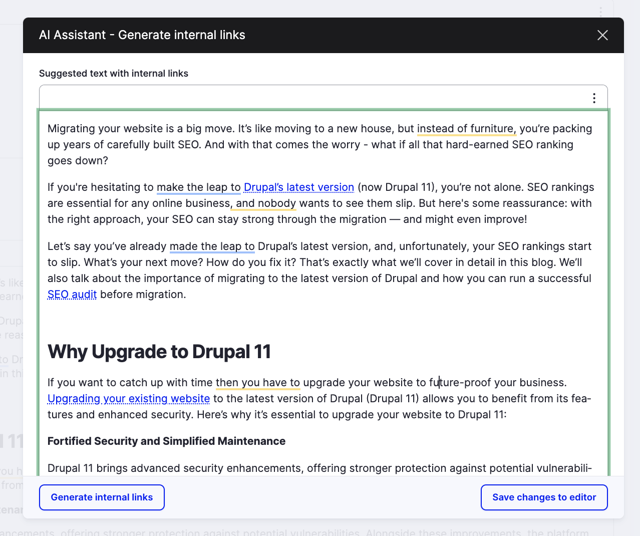 Internal linking is another important content task that is often skipped over due to the time involved. The SmartLinker AI module allows us to highlight a paragraph of text, enter the desired number of internal links along with any focus keywords, and the module will automatically create links to relevant pages on our site.