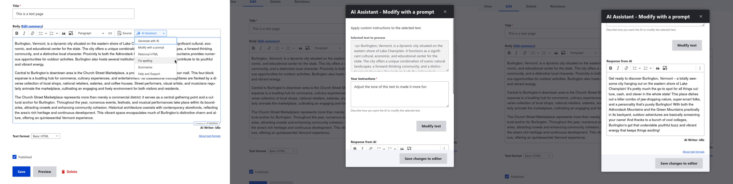 The AI CKEditor Assistant module adds some useful copy-editing features right into Drupal’s WYSIWYG editor: Generating text with AI, modifying text with a prompt, fixing spelling, summarizing, reformatting